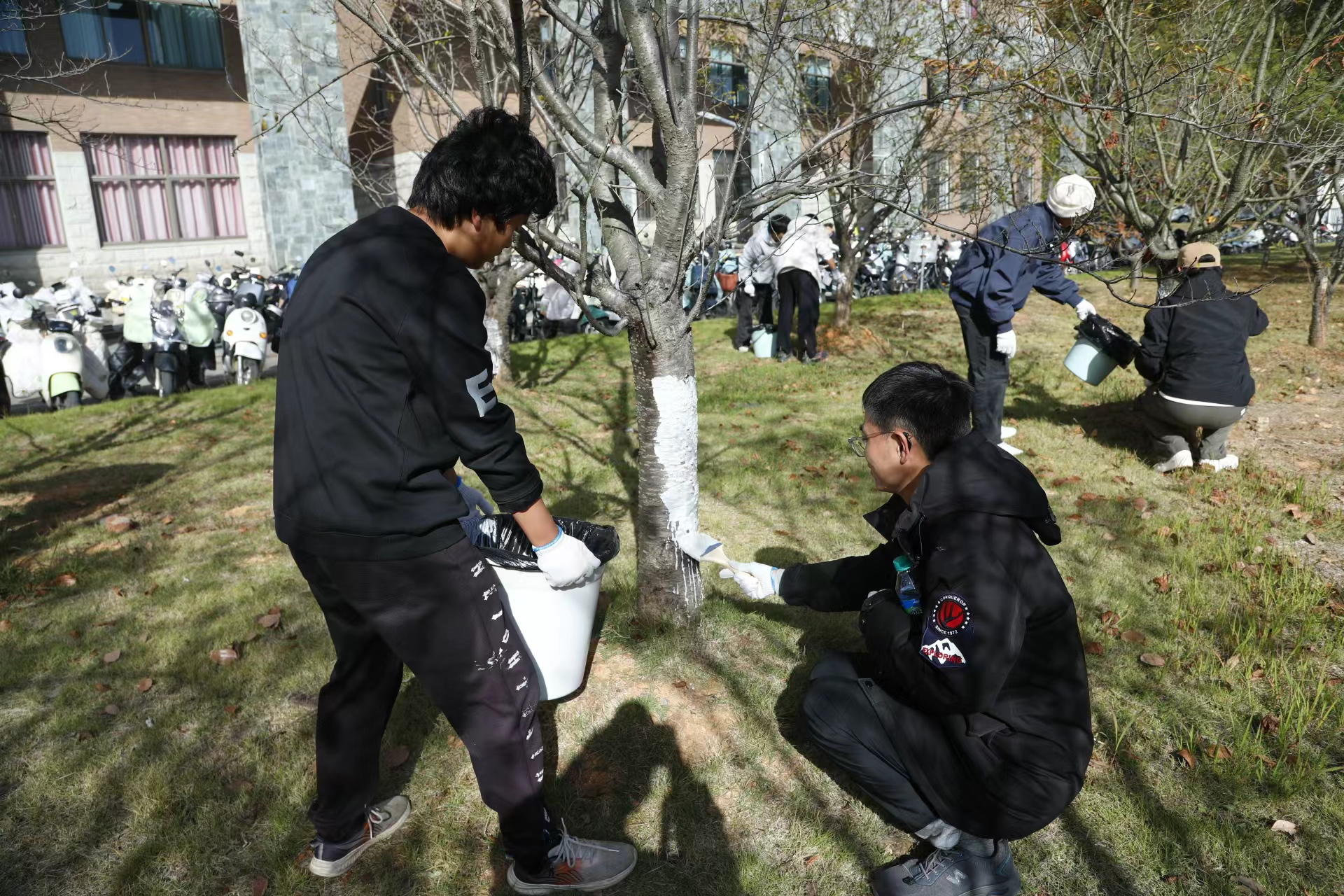 为深入践行“三全育人”宗旨,增强学生劳动意识,美化校园生态环境,助力树木健康过冬,11月25日下午,后勤管理处党支部与党委学工部(党委研工部、学工处)党支部于湘湖校区勤学楼南侧樱花林联合举办“涂白护树,温暖校园”活动。